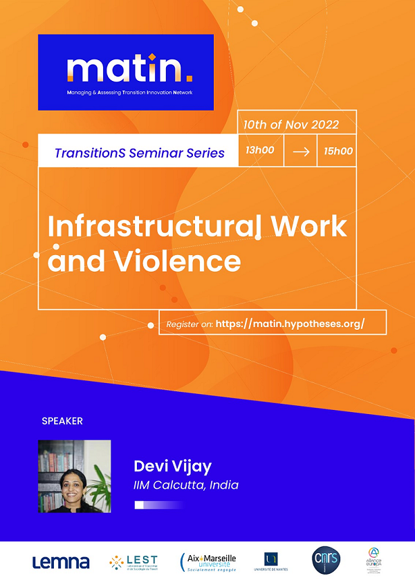 On the 10th of November we will have the pleasure to host an inaugural seminar of our transition series (Season 2) on vulnerabilities. Save the date ! At 13.00 CET, we will listen to Devi Vijay, Associate Professor, IIM Calcutta, India, on “"Killing us with Slow Poison": Infrastructural Work and Violence in a Global City"
