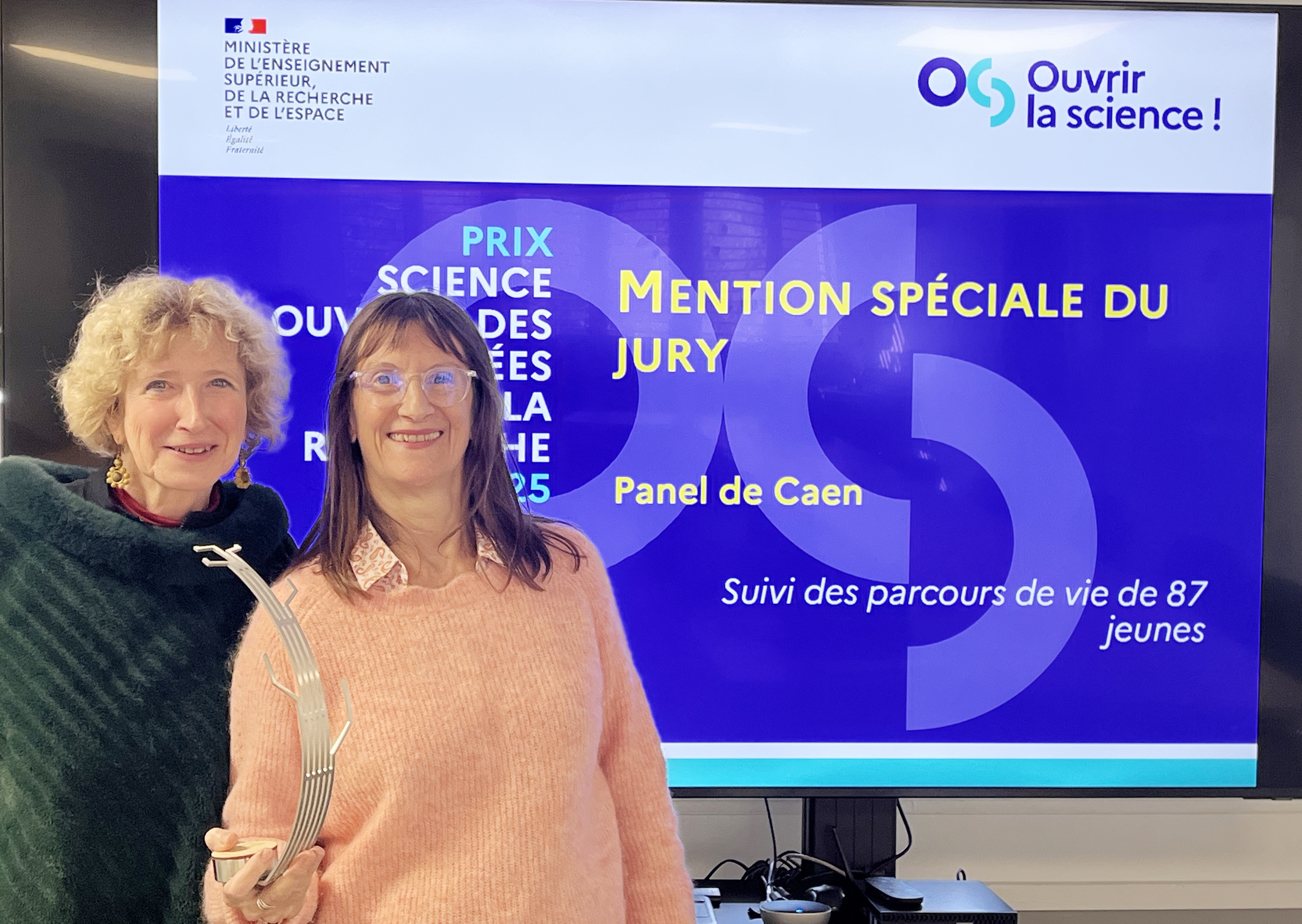 Prix Science Ouverte avec Anne Bonneville (à gauche), référente Science ouverte au LEST, et Claire Bidart, Directrice de Recherche CNRS au LEST, Responsable Scientifique du Panel de Caen.